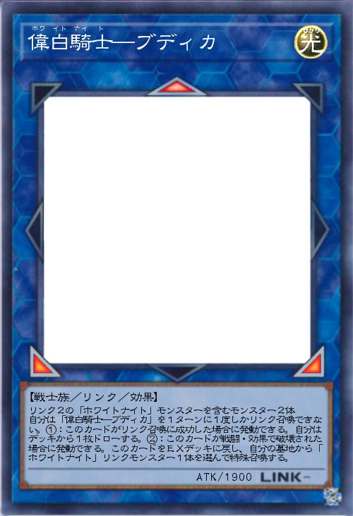 | リンク2の「ホワイトナイト」モンスターを含むモンスター2体 自分は「偉白騎士―ブディカ」を1ターンに1度しかリンク召喚できない。①:このカードがリンク召喚に成功した場合に発動できる。自分はデッキから1枚ドローする。②:このカードが戦闘・効果で破壊された場合に発動できる。このカードをEXデッキに戻し、自分の墓地から「ホワイトナイト」リンクモンスター1体を選んで特殊召喚する。 | |||