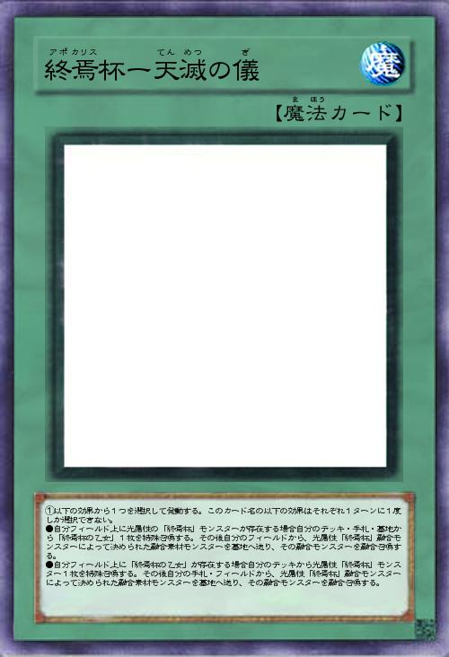 | ①以下の効果から1つを選択して発動する。このカード名の以下の効果はそれぞれ1ターンに1度しか選択できない。 ●自分フィールド上に光属性の「終焉杯」モンスターが存在する場合自分のデッキ・手札・墓地から「終焉杯の乙女」1枚を特殊召喚する。その後自分のフィールドから、光属性「終焉杯」融合モンスターによって決められた融合素材モンスターを墓地へ送り、その融合モンスターを融合召喚する。 ●自分フィールド上に「終焉杯の乙女」が存在する場合自分のデッキから光属性「終焉杯」モンスター1枚を特殊召喚する。その後自分の手札・フィールドから、光属性「終焉杯」融合モンスターによって決められた融合素材モンスターを墓地へ送り、その融合モンスターを融合召喚する。 | |||