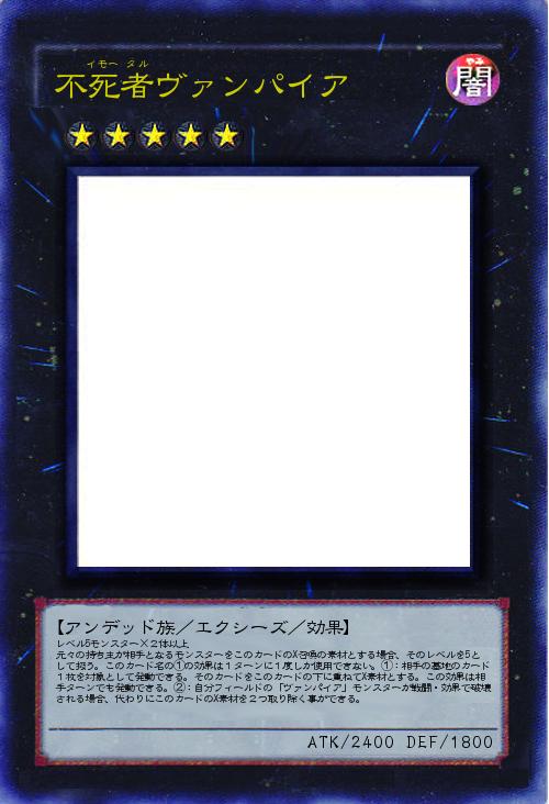 | レベル5モンスター×2体以上 元々の持ち主が相手となるモンスターをこのカードのX召喚の素材とする場合、そのレベルを5として扱う。このカード名の①の効果は1ターンに1度しか使用できない。①:相手の墓地のカード1枚を対象として発動できる。そのカードをこのカードの下に重ねてX素材とする。この効果は相手ターンでも発動できる。②:自分フィールドの「ヴァンパイア」モンスターが戦闘・効果で破壊される場合、代わりにこのカードのX素材を2つ取り除く事ができる。 | |||