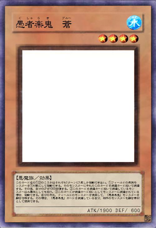 | このカード名の①③のこうかはそれぞれ1ターンに1度しか発動できない。①フィールドの表側モンスターを①対象にして発動できる。そのモンスターに手札のこのカードを装備カード扱いで装備する。その後、自分のLPを1000回復する。②このカードを装備カード扱いで装備しているモンスターは水属性としても扱う。③このカードが装備カード扱いとしてモンスターに装備されている場合、発動できる。自分の手札、フィールドのモンスターを使用して、「愚者楽鬼」モンスターを融合召喚する。その場合、「愚者楽鬼」カードを装備している自分、相手のモンスターも融合素材として使用できる。 | |||