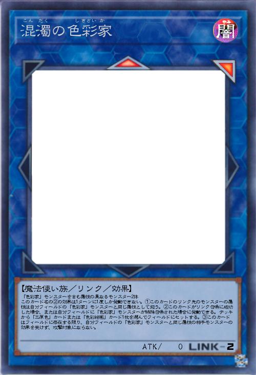 | 「色彩家」モンスターを含む属性の異なるモンスター2体 このカード名の②の効果は1ターンに1度しか発動できない。①このカードのリンク先のモンスターの属性は自分フィールドの「色彩家」モンスターと同じ属性として扱う。②このカードがリンク召喚に成功した場合、または自分フィールドに「色彩家」モンスターが特殊召喚された場合に発動できる。デッキから「三原色」カードまたは「色彩絵画」カード1枚を選んでフィールドにセットする。③このカードはフィールドに存在する限り、自分フィールドの「色彩家」モンスターと同じ属性の相手モンスターの効果を受けず、攻撃対象にならない。 | |||