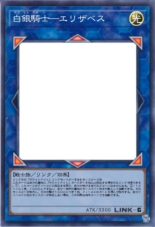 | リンク5の「ホワイトナイト」リンクモンスターを含むモンスター2体 このカードは自分の墓地に「ホワイトナイト」カードが15枚以上存在する場合のみリンク召喚できる。①:このカードがフィールドに存在する限り、自分が受ける全てのダメージは半分になる。②:1ターンに1度、1000LPを払い、自分・相手の墓地のモンスター1体を対象として発動できる。そのモンスターを除外し、その攻撃力1000につき1枚、フィールドのカードを選んで除外する。自分フィールドに他のモンスターが存在しない場合、この効果は相手ターンでも発動できる。 | |||