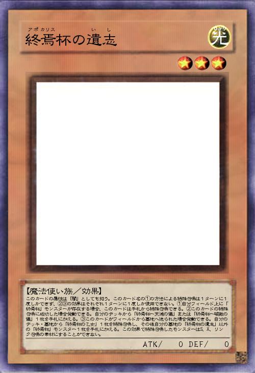 | このカードの属性は「闇」としても扱う。このカード名の①の方法による特殊召喚は1ターンに1度しかできず、②③の効果はそれぞれ1ターンに1度しか使用できない。①自分フィールド上に「終焉杯」モンスターが存在する場合、このカードは手札から特殊召喚できる。②このカードの特殊召喚に成功した場合発動できる。自分のデッキから「終焉杯ー天滅の儀」または「終焉杯ー破獄の儀」1枚を手札に加える。③このカードがフィールドから墓地へ送られた場合発動できる。自分のデッキ・墓地から「終焉杯の乙女」1枚を特殊召喚し、その後自分の墓地の「終焉杯の遺志」以外の「終焉杯」モンスター1枚を手札に加える。この効果で特殊召喚したモンスターはS、X、リンク召喚の素材にすることができない。 | |||