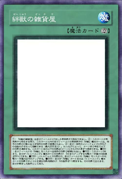 | ①:「絆獣の雑貨屋」は自分フィールドに1枚しか表側表示で存在できない。②:このカードが表側表示で存在する限り、このカード以外の自分フィールドの表側表示の「絆獣」魔法カードは、相手の効果の対象にならず相手の効果で破壊されない。③:自分・相手のメインフェイズに500LPの倍数のLPを払って発動できる(最大2000まで)。払ったLPによって、ターン終了時まで以下の効果を適用する。このカード名の以下の効果は1ターンにそれぞれ1度ずつ使用できる。●500:自分フィールドの「絆獣」モンスターは相手の効果で破壊されない。●1000:このターン2回まで、自分が「トレーニング」魔法カードの効果の1〜5の目でアップする攻撃力・守備力の数値を600にできる。●1500:バトルフェイズの間だけ、自分フィールドの「絆獣」モンスターの攻撃力・守備力は1500アップする。●2000:自分が「絆獣」カードまたは「トレーニ | |||