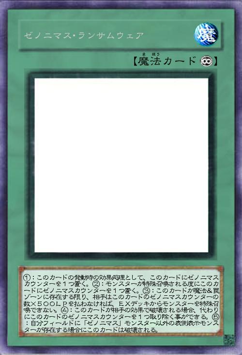 | ①:このカードの発動時の効果処理として、このカードにゼノニマスカウンターを1つ置く。②:モンスターが特殊召喚される度にこのカードにゼノニマスカウンターを1つ置く。③:このカードが魔法&罠ゾーンに存在する限り、相手はこのカードのゼノニマスカウンターの数×500LPを払わなければ、EXデッキからモンスターを特殊召喚できない。④:このカードが相手の効果で破壊される場合、代わりにこのカードのゼノニマスカウンターを1つ取り除く事ができる。⑤:自分フィールドに「ゼノニマス」モンスター以外の表側表示モンスターが存在する場合にこのカードは破壊される。 | |||