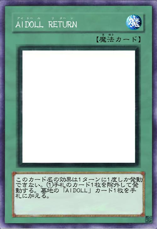 | このカード名の効果は1ターンに1度しか発動できない。①手札のカード1枚を除外して発動する。墓地の「AIDOLL」カード1枚を手札に加える。 | |||