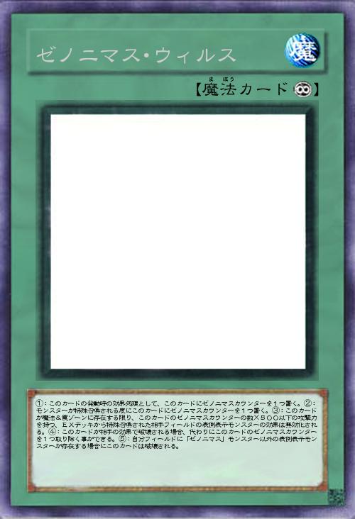 | ①:このカードの発動時の効果処理として、このカードにゼノニマスカウンターを1つ置く。②:モンスターが特殊召喚される度にこのカードにゼノニマスカウンターを1つ置く。③:このカードが魔法&罠ゾーンに存在する限り、このカードのゼノニマスカウンターの数×500以下の攻撃力を持つ、EXデッキから特殊召喚された相手フィールドの表側表示モンスターの効果は無効化される。④:このカードが相手の効果で破壊される場合、代わりにこのカードのゼノニマスカウンターを1つ取り除く事ができる。⑤:自分フィールドに「ゼノニマス」モンスター以外の表側表示モンスターが存在する場合にこのカードは破壊される。 | |||