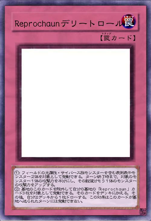 | ①:フィールドの光属性・サイバース族モンスターを含む表側表示モンスター2体を対象として発動できる。ターン終了時まで、対象のモンスター1体の攻撃力を半分にし、その数値分もう1体のモンスターの攻撃力をアップする。 ②:墓地のこのカードを除外して自分の墓地の「Reprochaun」カード3枚を対象として発動できる。そのカードをデッキに加える。その後、自分はデッキから1枚ドローする。この効果はこのカードが墓地へ送られたターンには発動できない。 | |||