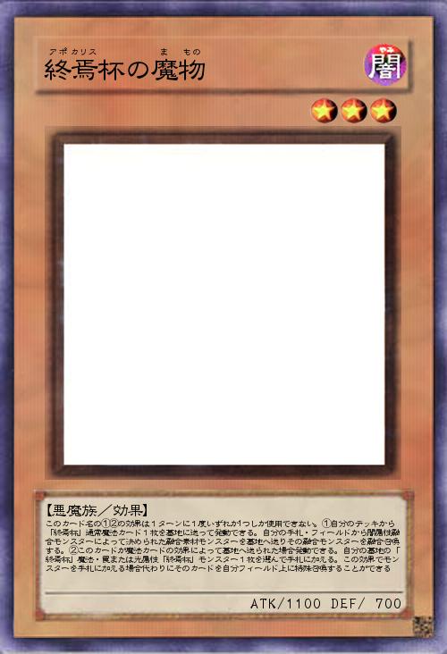 | このカード名の①②の効果は1ターンに1度いずれか1つしか使用できない。①自分のデッキから「終焉杯」通常魔法カード1枚を墓地に送って発動できる。自分の手札・フィールドから闇属性融合モンスターによって決められた融合素材モンスターを墓地へ送りその融合モンスターを融合召喚する。②このカードが魔法カードの効果によって墓地へ送られた場合発動できる。自分の墓地の「終焉杯」魔法・罠または光属性「終焉杯」モンスター1枚を選んで手札に加える。この効果でモンスターを手札に加える場合代わりにそのカードを自分フィールド上に特殊召喚することができる | |||