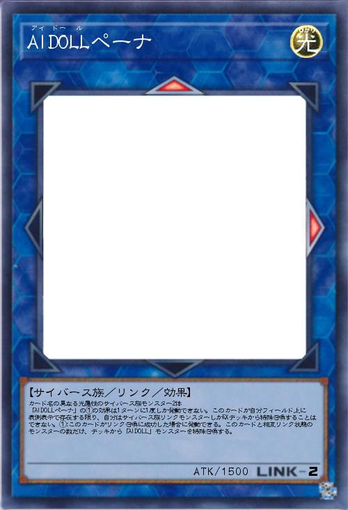 | カード名の異なる光属性のサイバース族モンスター2体 「AIDOLLペーナ」の①の効果は1ターンに1度しか発動できない。このカードが自分フィールド上に表側表示で存在する限り、自分はサイバース族リンクモンスターしかEXデッキから特殊召喚することはできない。①:このカードがリンク召喚に成功した場合に発動できる。このカードと相互リンク状態のモンスターの数だけ、デッキから「AIDOLL」モンスターを特殊召喚する。 | |||