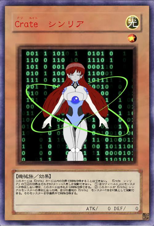| このカードは「Crate」カード以外の効果で特殊召喚することはできない。 「Crate シンリア」の①②の効果はそれぞれ1ターンに1度しか発動できない。 ①:自分フィールド上にモンスターが存在しない場合、このカードは手札から特殊召喚できる。 ②:このカードが「Crate」シンクロモンスターの素材となった時、自分の墓地の「Crate」 モンスター1体を対象として発動できる。そのモンスターを守備表示で特殊召喚する。 | |||