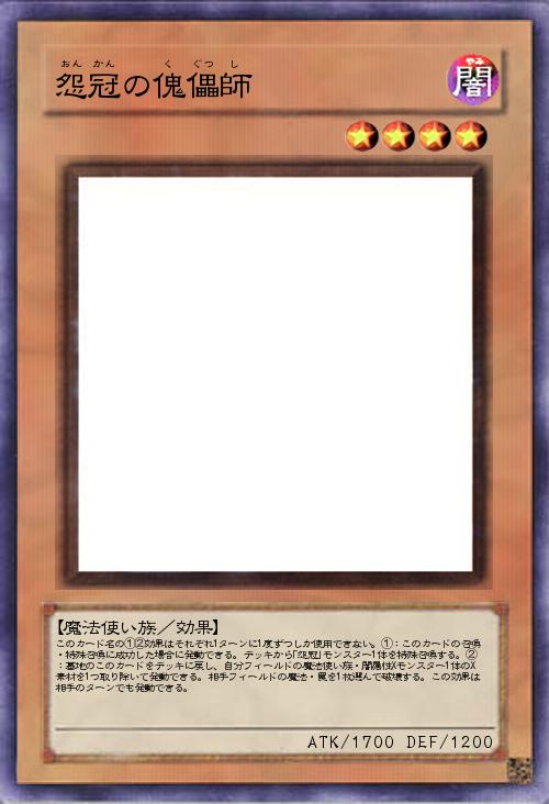 | このカード名の①②効果はそれぞれ1ターンに1度ずつしか使用できない。①:このカードの召喚・特殊召喚に成功した場合に発動できる。デッキから「怨冠」モンスター1体を特殊召喚する。②:墓地のこのカードをデッキに戻し、自分フィールドの魔法使い族・闇属性Xモンスター1体のX素材を1つ取り除いて発動できる。相手フィールドの魔法・罠を1枚選んで破壊する。この効果は相手のターンでも発動できる。 | |||