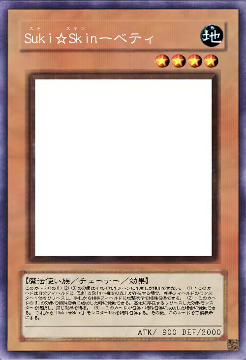 | このカード名の(1)(2)(3)の効果はそれぞれ1ターンに1度しか使用できない。 (1):このカードは自分フィールドに「Suki☆Skinー魔女の森」が存在する場合、相手フィールドのモンスター1体をリリースし、手札から相手フィールドに攻撃表示で特殊召喚できる。 (2):このカードの(1)の効果で特殊召喚に成功した時に発動できる。墓地に存在するリリースした効果モンスターを選択し、同じ効果を得る。 (3):このカードが召喚・特殊召喚に成功した場合に発動できる。 手札から「Suki☆Skin」モンスター1体を特殊召喚する。その後、このカードを守備表示にする。 | |||