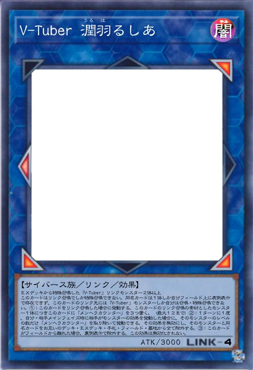 | EXデッキから特殊召喚した「V-Tuber」リンクモンスター2体以上 このカードはリンク召喚でしか特殊召喚できない。同名カードは1体しか自分フィールド上に表側表示で存在できず、このカードのリンク先には「V-Tuber」モンスターしか自分は召喚・特殊召喚できない。①:このカードをリンク召喚した場合に発動する。このカードのリンク召喚の素材としたモンスター1体につきこのカードに「メンヘラカウンター」を3つ置く。(最大12まで)②:1ターンに1度、自分・相手メインフェイズ時に相手がモンスターの効果を発動した場合に、そのモンスターのレベルの数だけ「メンヘラカウンター」を取り除いて発動できる。その効果を無効にし、そのモンスターと同名カードをお互いのデッキ・EXデッキ・手札・フィールド・墓地から全て除外する。③:このカードがフィールドから離れた場合、裏側表示で除外する。この効果は無効化されない。 | |||