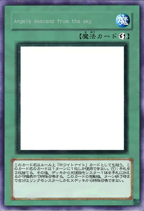 | このカード名はルール上「ホワイトナイト」カードとしても扱う。このカード名のカードは1ターンに1枚しか使用できない。①:手札を2枚捨てる。その後、デッキから天使族モンスター1体を手札に加えるか守備表示で特殊召喚する。このカードの発動後、ターン終了時まで自分はリンクモンスターしかEXデッキから特殊召喚できない。 | |||