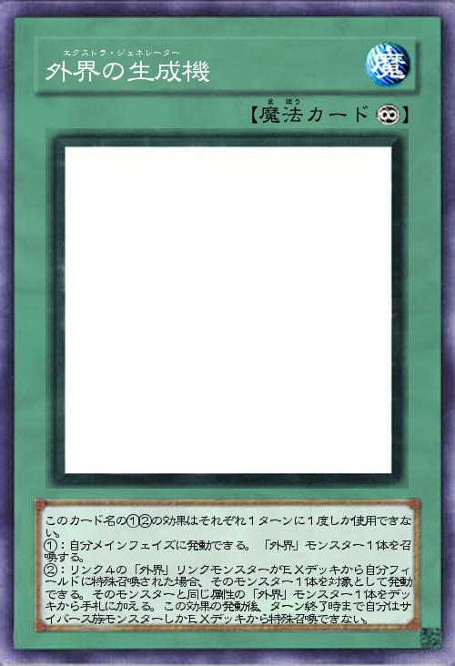 | このカード名の①②の効果はそれぞれ1ターンに1度しか使用できない。 ①:自分メインフェイズに発動できる。「外界」モンスター1体を召喚する。 ②:リンク4の「外界」リンクモンスターがEXデッキから自分フィールドに特殊召喚された場合、そのモンスター1体を対象として発動できる。そのモンスターと同じ属性の「外界」モンスター1体をデッキから手札に加える。この効果の発動後、ターン終了時まで自分はサイバース族モンスターしかEXデッキから特殊召喚できない。 | |||