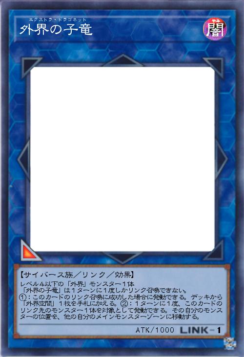 | レベル4以下の「外界」モンスター1体 「外界の子竜」は1ターンに1度しかリンク召喚できない。 ①:このカードのリンク召喚に成功した場合に発動できる。デッキから「外界空間」1枚を手札に加える。②:1ターンに1度、このカードのリンク先のモンスター1体を対象として発動できる。その自分のモンスターの位置を、他の自分のメインモンスターゾーンに移動する。 | |||