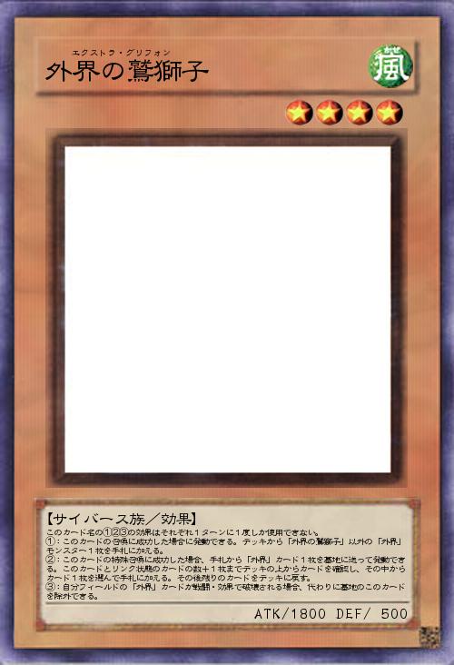 | このカード名の①②③の効果はそれぞれ1ターンに1度しか使用できない。 ①:このカードの召喚に成功した場合に発動できる。デッキから「外界の鷲獅子」以外の「外界」モンスター1枚を手札に加える。 ②:このカードの特殊召喚に成功した場合、手札から「外界」カード1枚を墓地に送って発動できる。このカードとリンク状態のカードの数+1枚までデッキの上からカードを確認し、その中からカード1枚を選んで手札に加える。その後残りのカードをデッキに戻す。 ③:自分フィールドの「外界」カードが戦闘・効果で破壊される場合、代わりに墓地のこのカードを除外できる。 | |||