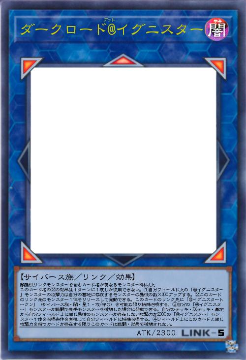 | 闇属性リンクモンスターを含むカード名が異なるモンスター3体以上 このカード名の②の効果は1ターンに1度しか使用できない。①自分フィールド上の「@イグニスター」モンスターの攻撃力は自分の墓地に存在するモンスターの属性の数×200アップする。②このカードのリンク先のモンスター1体をリリースして発動できる。このカードのリンク先に「@イグニスタートークン」(サイバース族・闇・星1・攻/守0)を可能な限り特殊召喚する。③自分の「@イグニスター」モンスターが戦闘で相手モンスターを破壊した場合に発動できる。自分のデッキ・EXデッキ・墓地から自分フィールド上に同じ属性のモンスターが存在しない攻撃力が2300の「@イグニスター」モンスター1体を召喚条件を無視して自分フィールドに特殊召喚する。④フィールド上にこのカードと同じ攻撃力を持つカードが存在する限りこのカードは戦闘・効果で破壊されない。 | |||