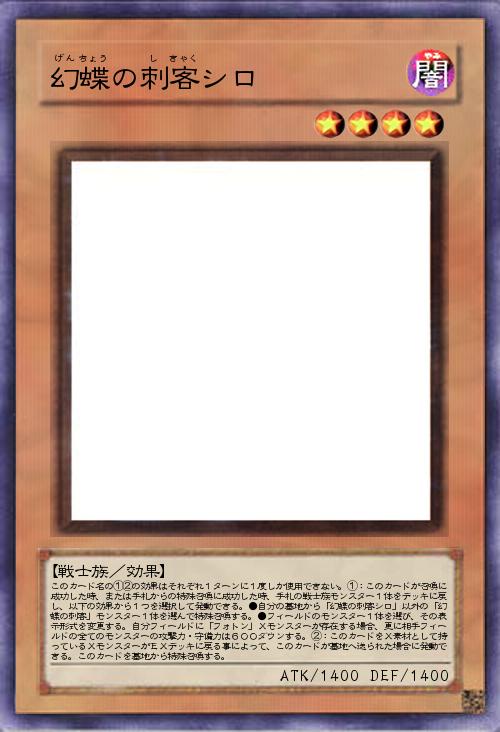 | このカード名の①②の効果はそれぞれ1ターンに1度しか使用できない。①:このカードが召喚に成功した時、または手札からの特殊召喚に成功した時、手札の戦士族モンスター1体をデッキに戻し、以下の効果から1つを選択して発動できる。●自分の墓地から「幻蝶の刺客シロ」以外の「幻蝶の刺客」モンスター1体を選んで特殊召喚する。●フィールドのモンスター1体を選び、その表示形式を変更する。自分フィールドに「フォトン」Xモンスターが存在する場合、更に相手フィールドの全てのモンスターの攻撃力・守備力は600ダウンする。②:このカードをX素材として持っているXモンスターがEXデッキに戻る事によって、このカードが墓地へ送られた場合に発動できる。このカードを墓地から特殊召喚する。 | |||