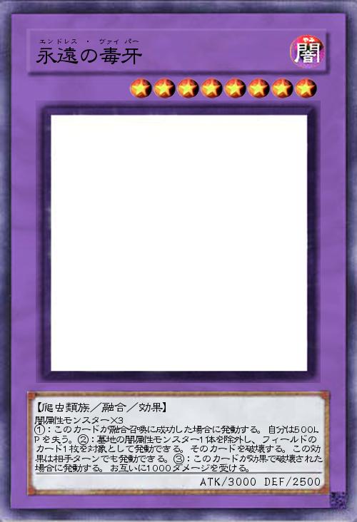 | 闇属性モンスター×3 ①:このカードが融合召喚に成功した場合に発動する。自分は500LPを失う。②:墓地の闇属性モンスター1体を除外し、フィールドのカード1枚を対象として発動できる。そのカードを破壊する。この効果は相手ターンでも発動できる。③:このカードが効果で破壊された場合に発動する。お互いに1000ダメージを受ける。 | |||
