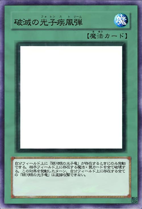 | 自分フィールド上に「銀河眼の光子竜」が存在するときにのみ発動できる。相手フィールド上に存在する魔法・罠カードを全て破壊する。この効果を発動したターン、自分フィールド上に存在する全ての「銀河眼の光子竜」は直接攻撃できない。 | |||