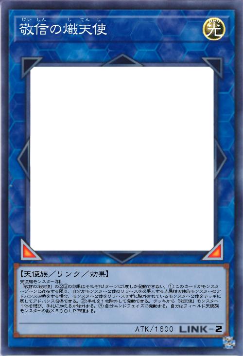 | 天使族モンスター2体 「敬信の熾天使」の②③の効果はそれぞれ1ターンに1度しか発動できない。①:このカードがモンスターゾーンに存在する限り、自分がモンスター2体のリリースを必要とする光属性天使族モンスターのアドバンス召喚をする場合、モンスター2体をリリースせずに除外されているモンスター2体をデッキに戻してアドバンス召喚できる。②:手札を1枚除外して発動できる。デッキから「熾天使」モンスター1体を選び、手札に加えるか除外する。③:自分エンドフェイズに発動する。自分はフィールド天使族モンスターの数×500LP回復する。 | |||
