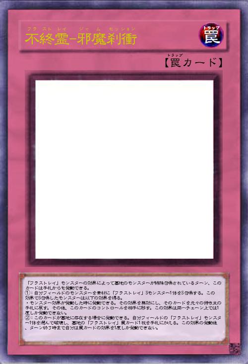 | 「フラストレイ」モンスターの効果によって墓地のモンスターが特殊召喚されているターン、このカードは手札からも発動できる。 ①:自分フィールドのモンスターを素材に「フラストレイ」Sモンスター1体をS召喚する。この効果でS召喚したモンスターは以下の効果を得る。 ・モンスター効果が発動した時に発動できる。その効果を無効にし、そのカードを元々の持ち主の手札に戻す。その後、このカードのコントロールを相手に移す。この効果は同一チェーン上では1度しか発動できない。 ②:このカードが墓地に存在する場合に発動できる。自分フィールドの「フラストレイ」モンスター1体を選んで破壊し、墓地の「フラストレイ」罠カード1枚を手札に加える。この効果の発動後、ターン終了時まで自分は罠カードの効果を1度しか発動できない。 | |||