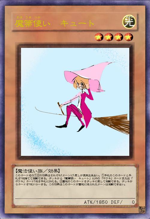 | このカード名の①②の効果はそれぞれ1ターンに1度しか使用出来ない。①手札のこのカードと手札を1枚捨てて発動できる。デッキから「魔箒使い キュート」以外の「ホウキ」カードまたは「ボウキ」カード1枚を手札に加える。②墓地のこのカードをデッキに戻して発動できる。デッキからカードを1枚ドローする。この効果はこのカードが墓地に送られたターンは発動できない。 | |||