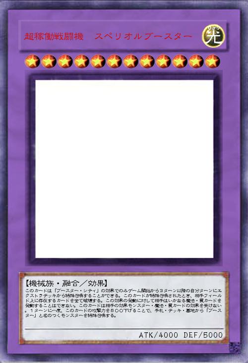| このカードは「ブースター・シティ」の効果でのみゲーム開始から3ターン以降の自分ターンにエクストラデッキから特殊召喚することができる。このカードが特殊召喚されたとき、相手フィールド上に存在するカードを全て破壊する。この効果の発動に対して相手はいかなる魔法・罠カードを発動することはできない。このカードは相手の効果モンスター・魔法・罠カードの効果を受けない。1ターンに一度、このカードの攻撃力を500下げることで、手札・デッキ・墓地から「ブースター」と名のつくモンスターを特殊召喚する。 | |||