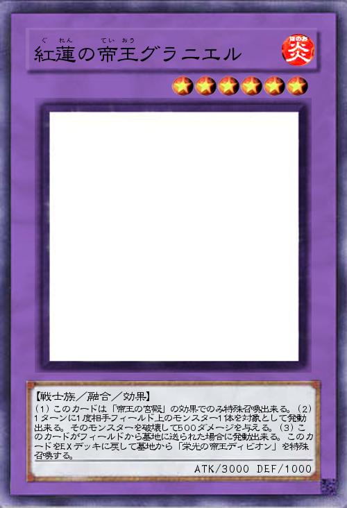 | (1)このカードは「帝王の宮殿」の効果でのみ特殊召喚出来る。(2)1ターンに1度相手フィールド上のモンスター1体を対象として発動出来る。そのモンスターを破壊して500ダメージを与える。(3)このカードがフィールドから墓地に送られた場合に発動出来る。このカードをEXデッキに戻して墓地から「栄光の帝王ディビオン」を特殊召喚する。 | |||