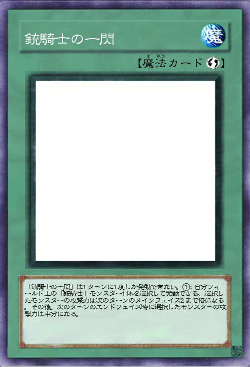 | 「銃騎士の一閃」は1ターンに1度しか発動できない。①:自分フィールド上の「銃騎士」モンスター1体を選択して発動できる。選択したモンスターの攻撃力は次のターンのメインフェイズ2まで倍になる。その後、次のターンのエンドフェイズ時に選択したモンスターの攻撃力は半分になる。 | |||