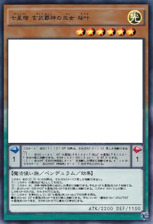 | このカード名の(1)(2)のP効果は、それぞれ1ターンに1度しか発動できない。 (1):自分フィールドの「七星宿」Xモンスター1体と「七星宿」Pモンスター1体を対象に発動できる。そのモンスターのランクとレベルを10にする。 (2):自分が「玄武の神座宝」カードを発動した場合に発動できる。デッキからそのカード名以外の「神座宝」カード1枚を手札に加える。 | |||
