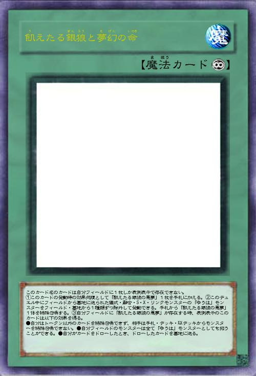 | このカード名のカードは自分フィールドに1枚しか表側表示で存在できない。 ①このカードの発動時の効果処理として「飢えたる銀狼の悪夢」1枚を手札に加える。②このデュエル中にフィールドから墓地に送られた儀式・融合・S・X・リンクモンスターの「ゆうは」モンスターをフィールド・墓地から1種類ずつ除外して発動できる。手札から「飢えたる銀狼の悪夢」1体を特殊召喚する。③自分フィールドに「飢えたる銀狼の悪夢」が存在する時、表側表示のこのカードは以下の効果を得る。 ●自分はトークン以外のカードを特殊召喚できず、相手は手札・デッキ・EXデッキからモンスターを特殊召喚できない。●自分フィールドのモンスターは全て「ゆうは」モンスターとしても扱うことができる。●自分がカードをドローしたとき、ドローしたカードを墓地に送る。 | |||