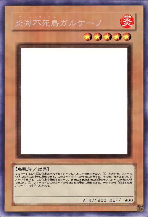 | このカード名の①②の効果はそれぞれ1ターンに1度しか使用できない。①:自分がモンスターの召喚に成功した場合に発動できる。このカードを手札から特殊召喚する。その後、自分は500ダメージを受ける。この効果を発動するターン、自分は鳥獣族または炎属性モンスターしか特殊召喚できない。②:フィールドのこのカードが破壊された場合に発動できる。デッキから「炎湖不死鳥」カード1枚を手札に加える。 | |||