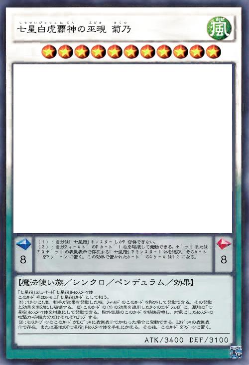 | (1):自分は「七星宿」モンスターしかP召喚できない。 (2):自分フィールドのPカード1枚を破壊して発動できる。デッキまたはEXデッキの表側表示で存在する「七星宿」Pモンスター1体を選び、そのカードをPゾーンに置く。この効果で置かれたカードのスケールは12になる。 | |||