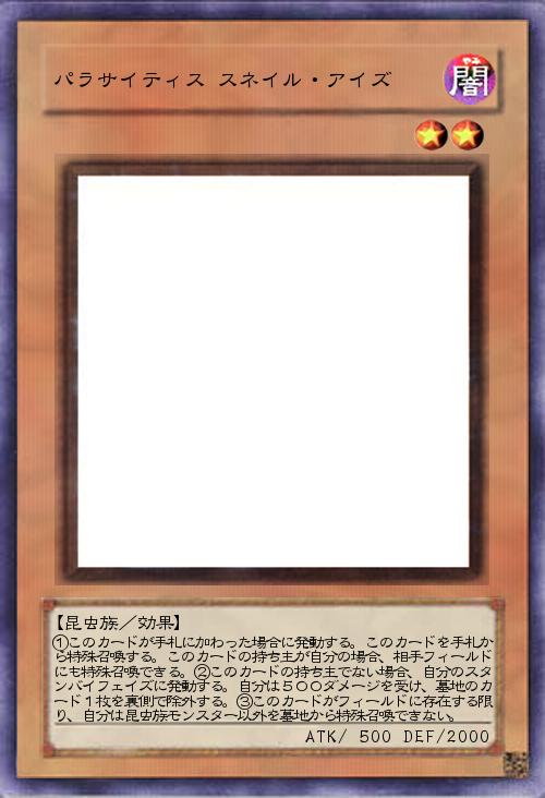 | ①このカードが手札に加わった場合に発動する。このカードを手札から特殊召喚する。このカードの持ち主が自分の場合、相手フィールドにも特殊召喚できる。②このカードの持ち主でない場合、自分のスタンバイフェイズに発動する。自分は500ダメージを受け、墓地のカード1枚を裏側で除外する。③このカードがフィールドに存在する限り、自分は昆虫族モンスター以外を墓地から特殊召喚できない。 | |||
