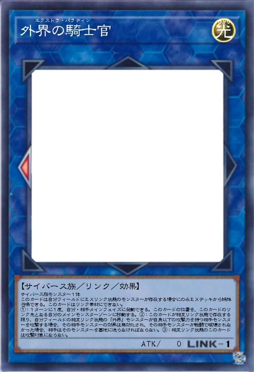 | サイバース族モンスター1体 このカードは自分フィールドにEXリンク状態のモンスターが存在する場合にのみEXデッキから特殊召喚できる。このカードはリンク素材にできない。 ①:1ターンに1度、自分・相手メインフェイズに発動できる。このカードの位置を、このカードのリンク先となる自分のメインモンスターゾーンに移動する。②:このカードが相互リンク状態で存在する限り、自分フィールドの相互リンク状態の「外界」モンスターが自身以下の攻撃力を持つ相手モンスターを攻撃する場合、その相手モンスターの効果は無効化され、その相手モンスターが戦闘で破壊されなかった場合、相手はそのモンスターを墓地に送らなければならない。③:相互リンク状態のこのカードは攻撃対象にならない。 | |||
