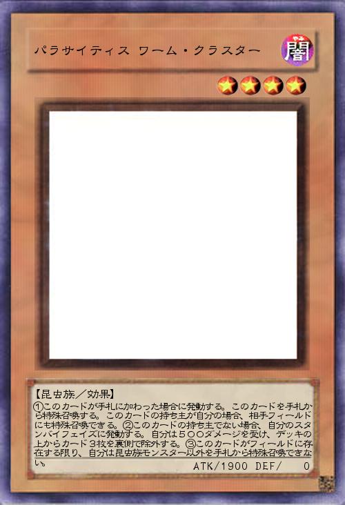 | ①このカードが手札に加わった場合に発動する。このカードを手札から特殊召喚する。このカードの持ち主が自分の場合、相手フィールドにも特殊召喚できる。②このカードの持ち主でない場合、自分のスタンバイフェイズに発動する。自分は500ダメージを受け、デッキの上からカード3枚を裏側で除外する。③このカードがフィールドに存在する限り、自分は昆虫族モンスター以外を手札から特殊召喚できない。 | |||