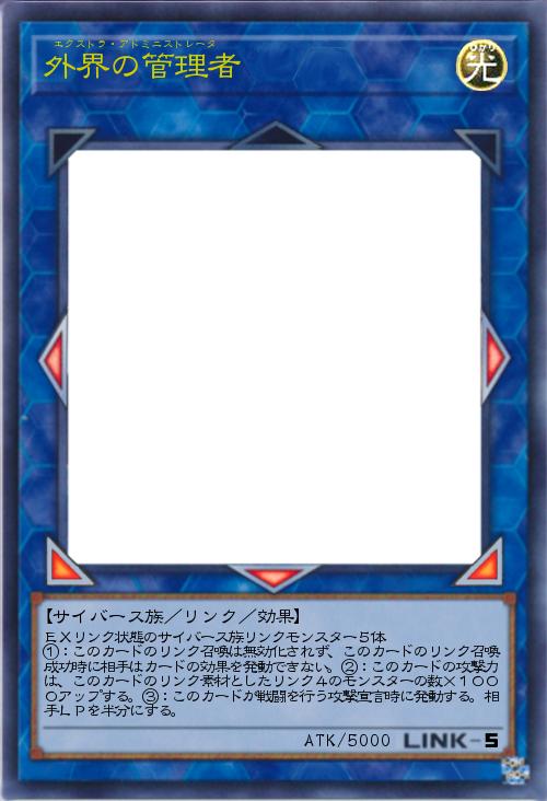 | EXリンク状態のサイバース族リンクモンスター5体 ①:このカードのリンク召喚は無効化されず、このカードのリンク召喚成功時に相手はカードの効果を発動できない。②:このカードの攻撃力は、このカードのリンク素材としたリンク4のモンスターの数×1000アップする。③:このカードが戦闘を行う攻撃宣言時に発動する。相手LPを半分にする。 | |||