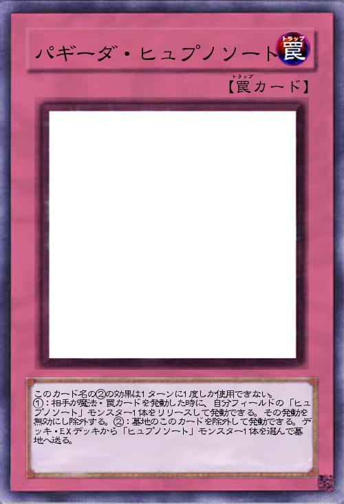 | このカード名の②の効果は1ターンに1度しか使用できない。 ①:相手が魔法・罠カードを発動した時に、自分フィールドの「ヒュプノソート」モンスター1体をリリースして発動できる。その発動を無効にし除外する。②:墓地のこのカードを除外して発動できる。デッキ・EXデッキから「ヒュプノソート」モンスター1体を選んで墓地へ送る。 | |||