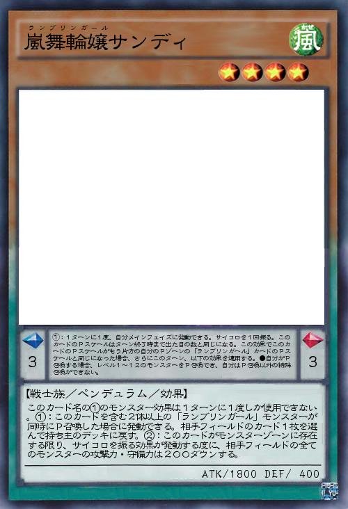 | このカード名の①のモンスター効果は1ターンに1度しか使用できない。①:このカードを含む2体以上の「ランブリンガール」モンスターが同時にP召喚した場合に発動できる。相手フィールドのカード1枚を選んで持ち主のデッキに戻す。②:このカードがモンスターゾーンに存在する限り、サイコロを振る効果が発動する度に、相手フィールドの全てのモンスターの攻撃力・守備力は200ダウンする。 | |||