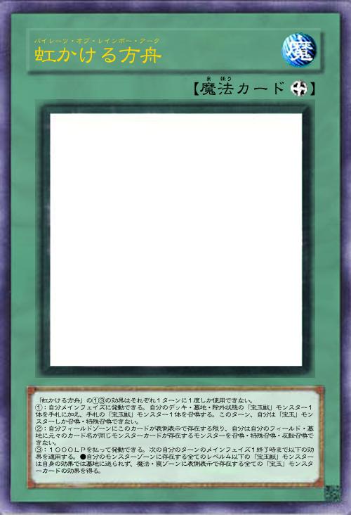 | 「虹かける方舟」の①③の効果はそれぞれ1ターンに1度しか使用できない。 ①:自分メインフェイズに発動できる。自分のデッキ・墓地・除外状態の「宝玉獣」モンスター1体を手札に加え、手札の「宝玉獣」モンスター1体を召喚する。このターン、自分は「宝玉」モンスターしか召喚・特殊召喚できない。 ②:自分フィールドゾーンにこのカードが表側表示で存在する限り、自分は自分のフィールド・墓地に元々のカード名が同じモンスターカードが存在するモンスターを召喚・特殊召喚・反転召喚できない。 ③:1000LPを払って発動できる。次の自分のターンのメインフェイズ1終了時まで以下の効果を適用する。●自分のモンスターゾーンに存在する全てのレベル4以下の「宝玉獣」モンスターは自身の効果では墓地に送られず、魔法・罠ゾーンに表側表示で存在する全ての「宝玉」モンスターカードの効果を得る。 | |||
