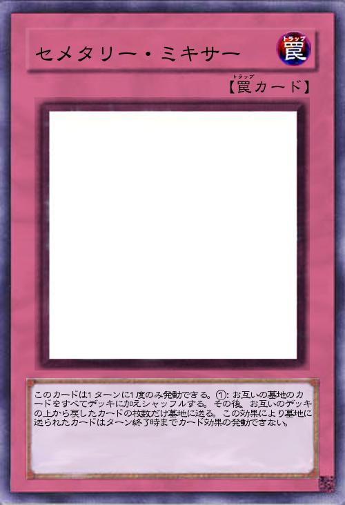 | このカードは1ターンに1度のみ発動できる。①:お互いの墓地のカードをすべてデッキに加えシャッフルする。その後、お互いのデッキの上から戻したカードの枚数だけ墓地に送る。この効果により墓地に送られたカードはターン終了時までカード効果の発動できない。 | |||