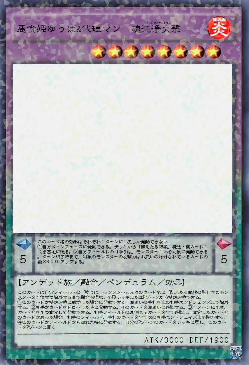 | このカードは自分フィールドの「ゆうは」モンスターと元々のカード名に「飢えたる銀狼の影」含むモンスターを1体ずつ除外する事で融合召喚扱いでEXデッキまたはPゾーンから特殊召喚できる。 ①このカードが特殊召喚に成功した場合に発動できる。お互いの手札を次の相手エンドフェンズまで除外する。②相手がカードをドローした時に発動する。そのカードをお互いに確認する。③1ターンに1度、カード名を1つ宣言して発動できる。相手フィールドの裏側表示カードを全て確認し、宣言したカード名のカードがあった場合、相手のフィールド、手札のカードを全て次の相手エンドフェイズまで除外する。④このカードがフィールドから離れた時に発動する。自分のPゾーンのカードをデッキに戻し、このカードをPゾーンに置く | |||