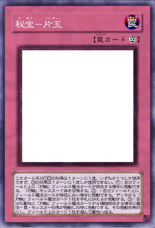 | このカード名の①②の効果は1ターンに1度、いずれか1つしか使用できず、③の効果は1ターンに1度しか使用できない。①:自分フィールド上に「片輪」フィールド魔法カードが存在する場合に発動できる。「片輪」モンスター1体を召喚する。② :自分フィールド上にフィールド魔法カードが存在しない場合に発動できる。デッキから「片輪」フィールド魔法カード1枚を手札に加えるか発動する。③:自分の墓地に「片輪」フィールド魔法カードが4種類存在する場合に魔法・罠・モンスター効果が発動した時に発動できる。その発動を無効にし、フィールド上のカード1枚を選んで墓地へ送る。 | |||