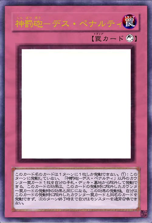 | このカード名のカードは1ターンに1枚しか発動できない。①:このターンに発動していない、「神罰砲-デス・ペナルティ」以外のカウンター罠カード1枚を自分の手札・デッキ・墓地から除外して発動できる。このカードの効果は、このカードの発動時に除外したカウンター罠カードの発動時の効果と同じになる。この効果の発動後、自分はこのカードの発動時に除外したカウンター罠カードと同名のカードを発動できず、次のターン終了時まで自分はモンスターを通常召喚できない。 | |||