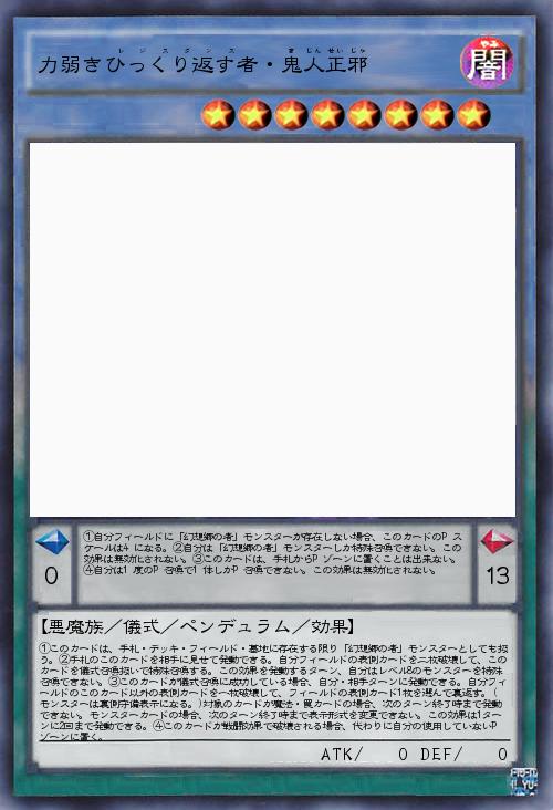 | ①このカードは、手札・デッキ・フィールド・墓地に存在する限り「幻想郷の者」モンスターとしても扱う。②手札のこのカードを相手に見せて発動できる。自分フィールドの表側カードを二枚破壊して、このカードを儀式召喚扱いで特殊召喚する。この効果を発動するターン、自分はレベル8のモンスターを特殊召喚できない。③このカードが儀式召喚に成功している場合、自分・相手ターンに発動できる。自分フィールドのこのカード以外の表側カードを一枚破壊して、フィールドの表側カード1枚を選んで裏返す。(モンスターは裏側守備表示になる。)対象のカードが魔法・罠カードの場合、次のターン終了時まで発動できない。モンスターカードの場合、次のターン終了時まで表示形式を変更できない。この効果は1ターンに2回まで発動できる。④このカードが戦闘効果で破壊される場合、代わりに自分の使用していないPゾーンに置く。 | |||