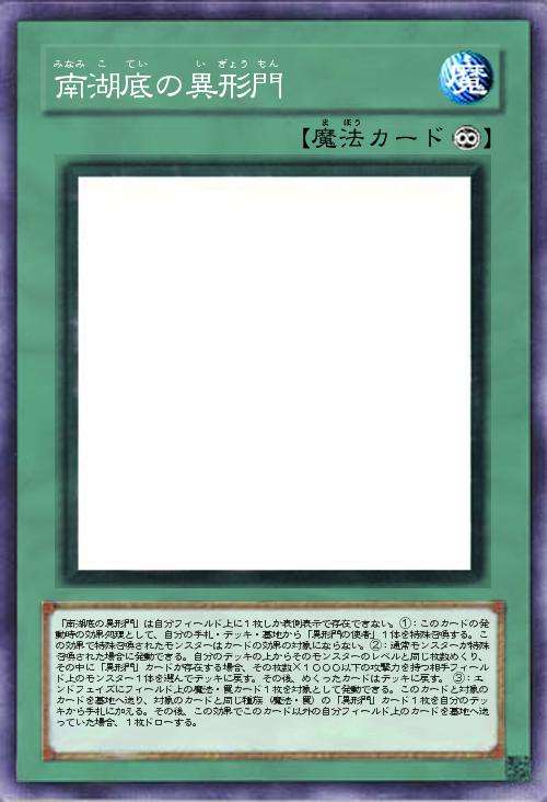 | 「南湖底の異形門」は自分フィールド上に1枚しか表側表示で存在できない。①:このカードの発動時の効果処理として、自分の手札・デッキ・墓地から「異形門の使者」1体を特殊召喚する。この効果で特殊召喚されたモンスターはカードの効果の対象にならない。②:通常モンスターが特殊召喚された場合に発動できる。自分のデッキの上からそのモンスターのレベルと同じ枚数めくり、その中に「異形門」カードが存在する場合、その枚数×1000以下の攻撃力を持つ相手フィールド上のモンスター1体を選んでデッキに戻す。その後、めくったカードはデッキに戻す。 ③:エンドフェイズにフィールド上の魔法・罠カード1枚を対象として発動できる。このカードと対象のカードを墓地へ送り、対象のカードと同じ種族(魔法・罠)の「異形門」カード1枚を自分のデッキから手札に加える。その後、この効果でこのカード以外の自分フィールド上のカードを墓地へ送っていた | |||