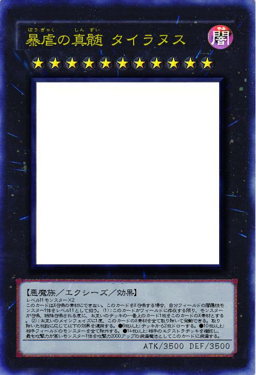 | レベル11モンスター×2 このカードはX召喚の素材にできない。このカードをX召喚する場合、自分フィールドの闇属性モンスター1体をレベル11として扱う。(1):このカードがフィールドに存在する限り、モンスターが召喚、特殊召喚される度に、お互いのデッキの一番上のカード1枚をこのカードのX素材とする。(2):お互いのメインフェイズに1度、このカードのX素材を全て取り除いて発動できる。取り除いた枚数に応じて以下の効果を適用する。●6枚以上:デッキから2枚ドローする。●10枚以上:相手フィールドのモンスターを全て除外する。●14枚以上:相手のエクストラデッキを確認し、最も攻撃力が高いモンスター1体を攻撃力2000アップの装備魔法としてこのカードに装備する。 | |||
